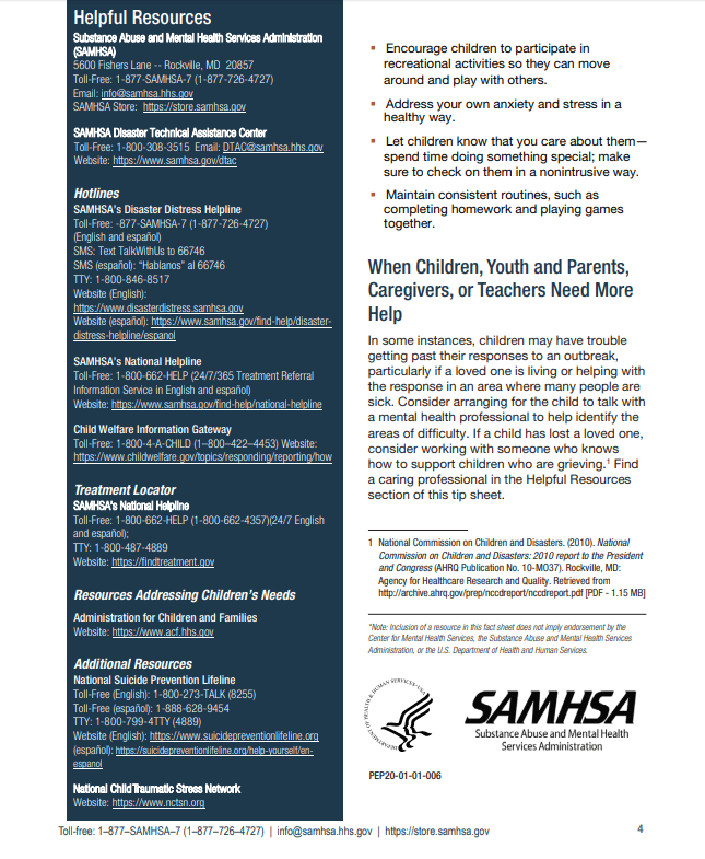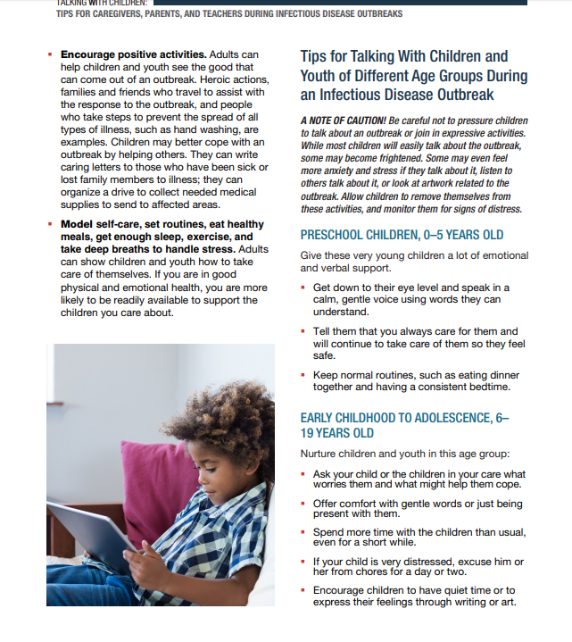 Below is some helpful information from SAMHSA about talking with children during infectious disease outbreaks. For more publications on this topic and other valuable insight, please visit their website.